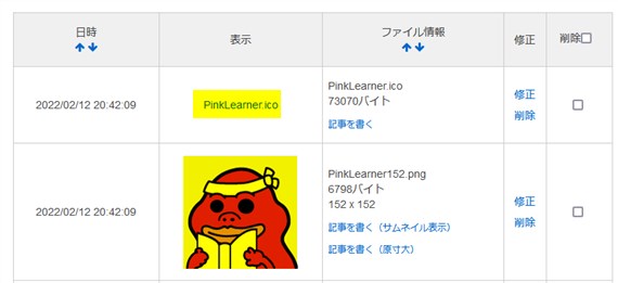 ③アップロードした画像サムネイル(ICOのほうは、文字)をクリックし、表示させる。