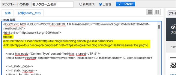 ⑦HTML編集の画面の<head></head>内に、以下のコードを記述する。