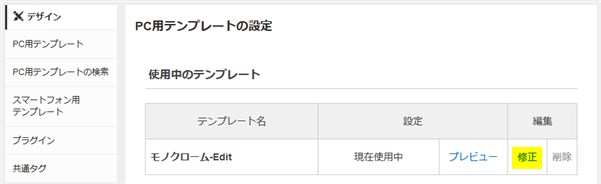 ⑥「デザイン」>「PC用テンプレートの設定」から、現在使用中のテンプレートの「修正」をクリックする。