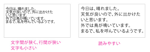 フォントは、情報を与えるツールになります。1行ですむ文もあれば、複数行に渡ってたくさんの情報を伝える内容もありますから、読者にとって疲れさせない、読んだ後に目が痛くならない文字ならびにしてください。